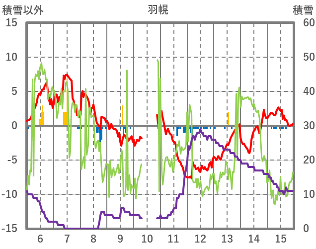 | 日 | 時 | 気温 | 降水 | 風向/風速 | 日照 | 積雪 | 降雪 |