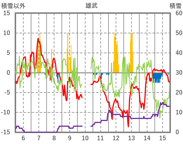 | 日 | 時 | 気温 | 降水 | 風向/風速 | 日照 | 積雪 | 降雪 |