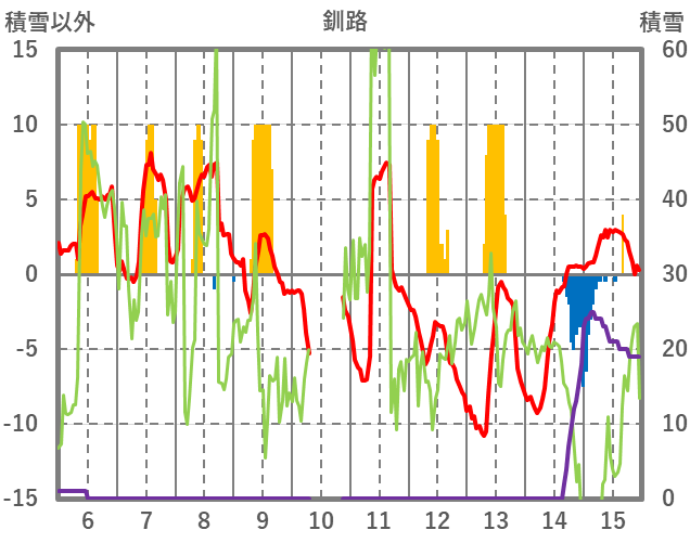 | 日 | 時 | 気温 | 降水 | 風向/風速 | 日照 | 積雪 | 降雪 |