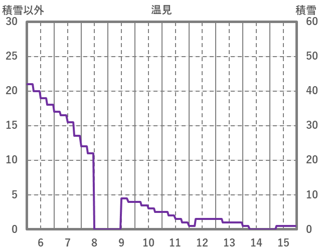 | 日 | 時 | 気温 | 降水 | 風向/風速 | 日照 | 積雪 | 降雪 |