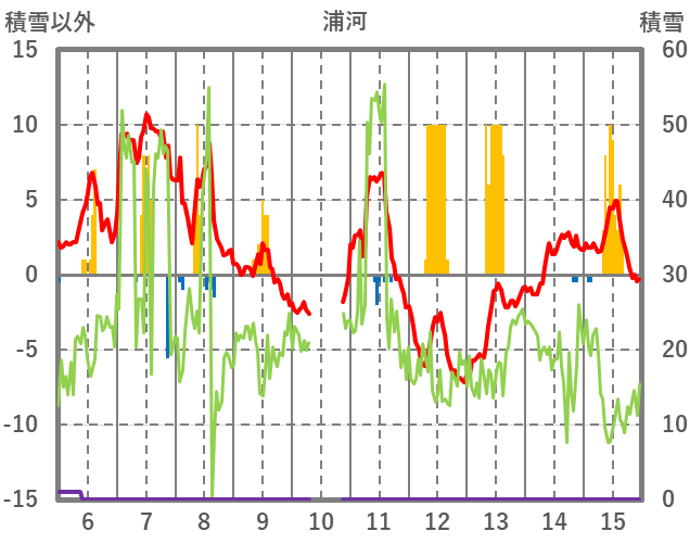 | 日 | 時 | 気温 | 降水 | 風向/風速 | 日照 | 積雪 | 降雪 |