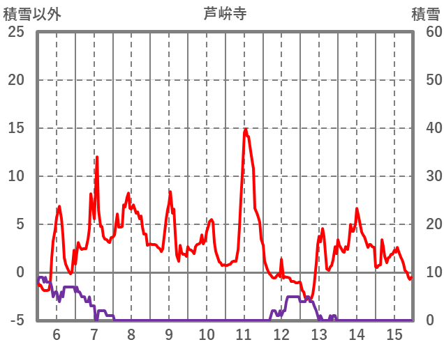 | 日 | 時 | 気温 | 降水 | 風向/風速 | 日照 | 積雪 | 降雪 |
