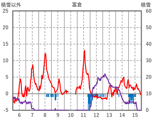 | 日 | 時 | 気温 | 降水 | 風向/風速 | 日照 | 積雪 | 降雪 |
