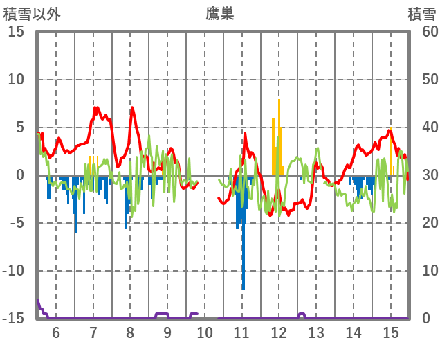 | 日 | 時 | 気温 | 降水 | 風向/風速 | 日照 | 積雪 | 降雪 |