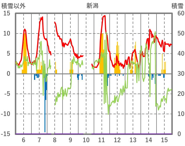 | 日 | 時 | 気温 | 降水 | 風向/風速 | 日照 | 積雪 | 降雪 |