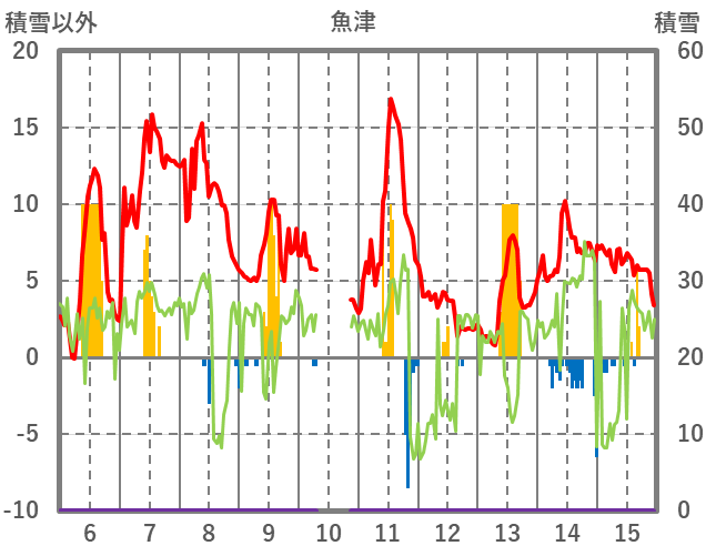 | 日 | 時 | 気温 | 降水 | 風向/風速 | 日照 | 積雪 | 降雪 |