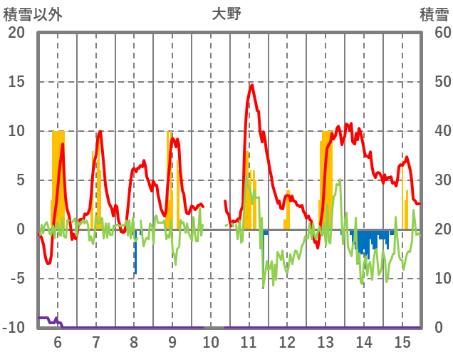 | 日 | 時 | 気温 | 降水 | 風向/風速 | 日照 | 積雪 | 降雪 |