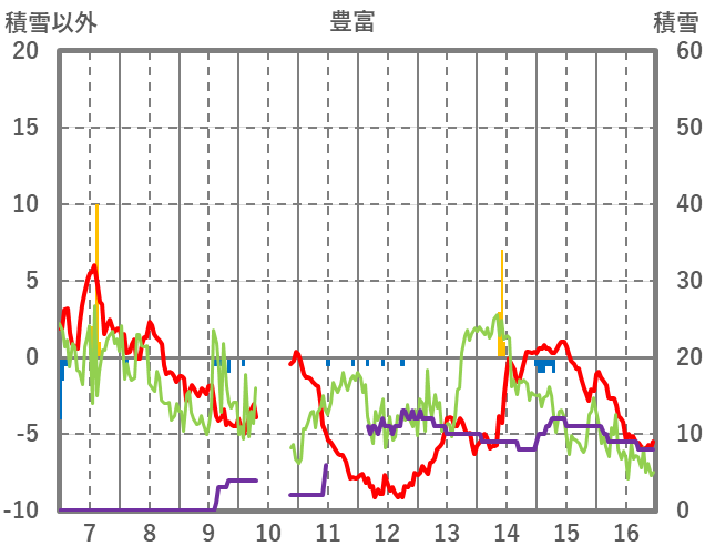 | 日 | 時 | 気温 | 降水 | 風向/風速 | 日照 | 積雪 | 降雪 |