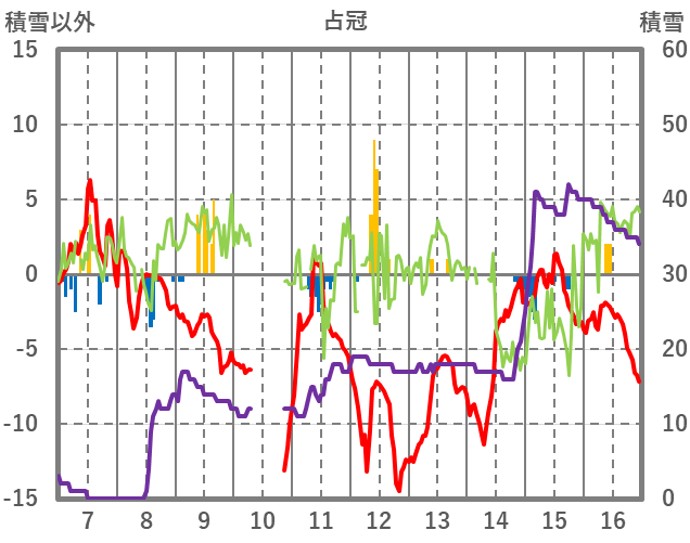 | 日 | 時 | 気温 | 降水 | 風向/風速 | 日照 | 積雪 | 降雪 |