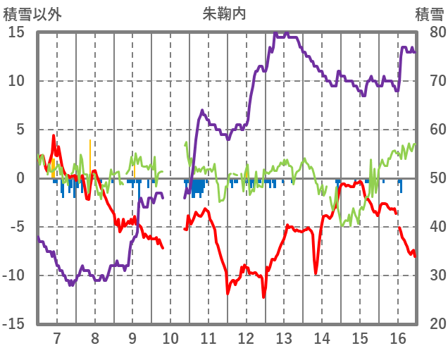 | 日 | 時 | 気温 | 降水 | 風向/風速 | 日照 | 積雪 | 降雪 |