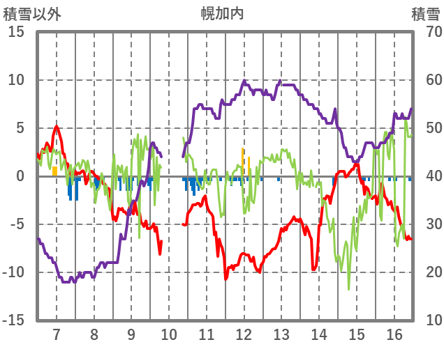 | 日 | 時 | 気温 | 降水 | 風向/風速 | 日照 | 積雪 | 降雪 |