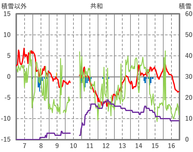 | 日 | 時 | 気温 | 降水 | 風向/風速 | 日照 | 積雪 | 降雪 |