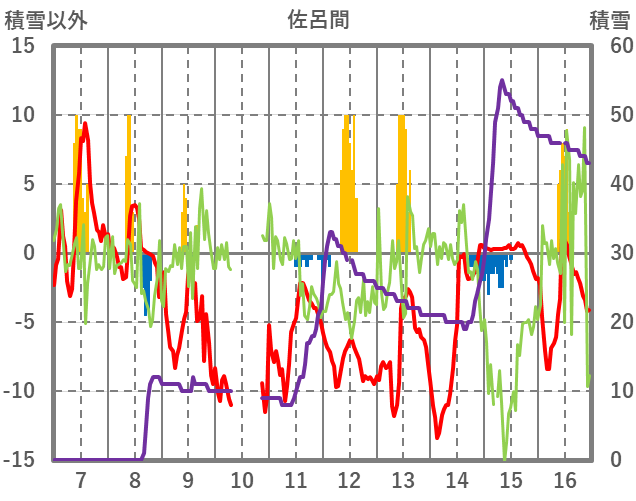 | 日 | 時 | 気温 | 降水 | 風向/風速 | 日照 | 積雪 | 降雪 |