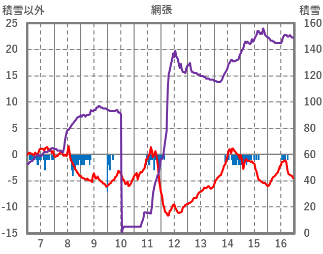| 日 | 時 | 気温 | 降水 | 風向/風速 | 日照 | 積雪 | 降雪 |
