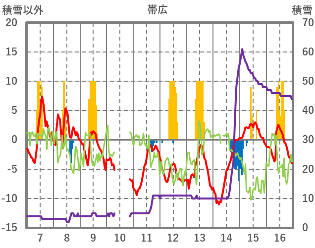 | 日 | 時 | 気温 | 降水 | 風向/風速 | 日照 | 積雪 | 降雪 |