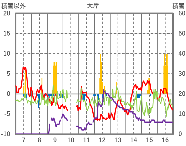 | 日 | 時 | 気温 | 降水 | 風向/風速 | 日照 | 積雪 | 降雪 |