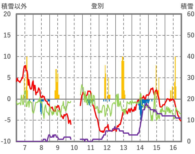 | 日 | 時 | 気温 | 降水 | 風向/風速 | 日照 | 積雪 | 降雪 |