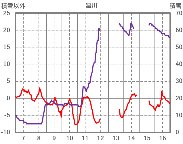 | 日 | 時 | 気温 | 降水 | 風向/風速 | 日照 | 積雪 | 降雪 |