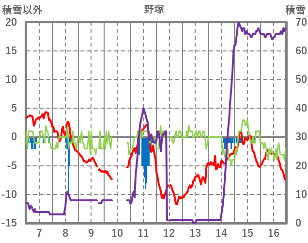 | 日 | 時 | 気温 | 降水 | 風向/風速 | 日照 | 積雪 | 降雪 |