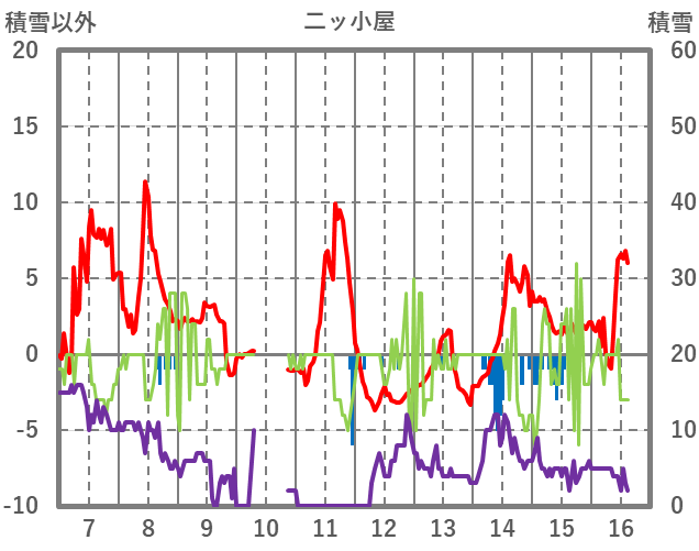 | 日 | 時 | 気温 | 降水 | 風向/風速 | 日照 | 積雪 | 降雪 |