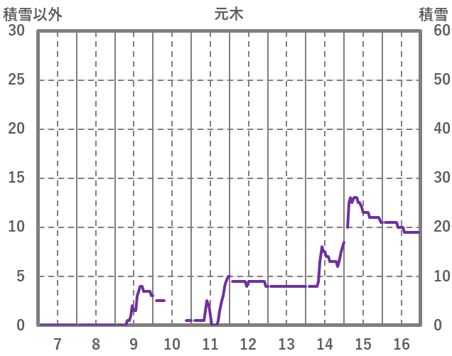 | 日 | 時 | 気温 | 降水 | 風向/風速 | 日照 | 積雪 | 降雪 |