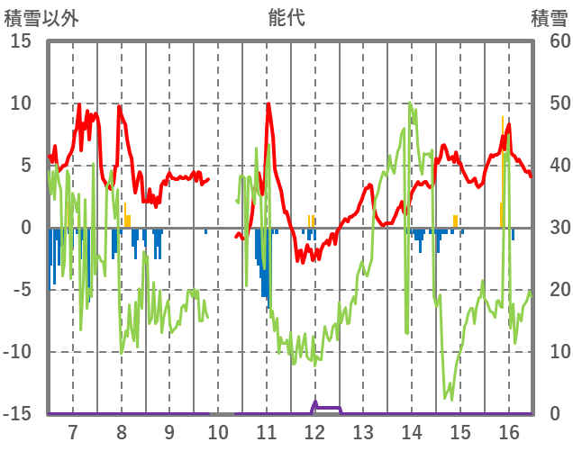 | 日 | 時 | 気温 | 降水 | 風向/風速 | 日照 | 積雪 | 降雪 |