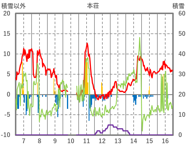 | 日 | 時 | 気温 | 降水 | 風向/風速 | 日照 | 積雪 | 降雪 |