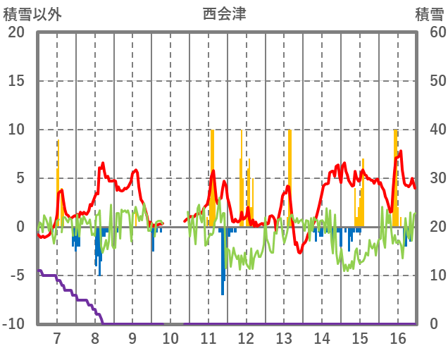 | 日 | 時 | 気温 | 降水 | 風向/風速 | 日照 | 積雪 | 降雪 |