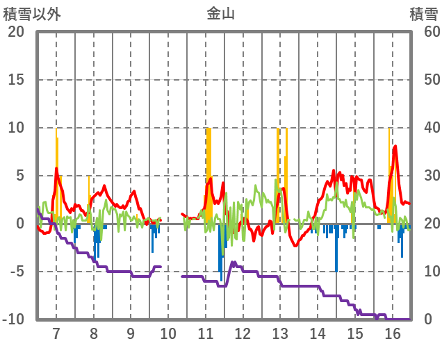 | 日 | 時 | 気温 | 降水 | 風向/風速 | 日照 | 積雪 | 降雪 |