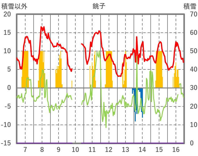 | 日 | 時 | 気温 | 降水 | 風向/風速 | 日照 | 積雪 | 降雪 |