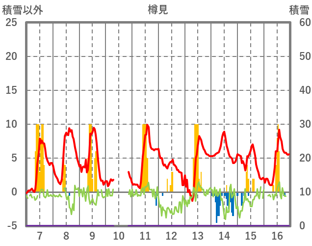 | 日 | 時 | 気温 | 降水 | 風向/風速 | 日照 | 積雪 | 降雪 |