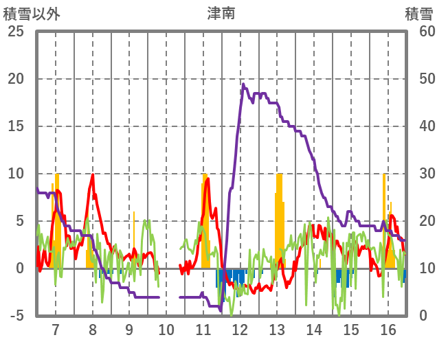 | 日 | 時 | 気温 | 降水 | 風向/風速 | 日照 | 積雪 | 降雪 |