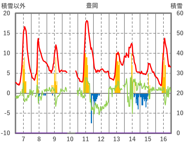 | 日 | 時 | 気温 | 降水 | 風向/風速 | 日照 | 積雪 | 降雪 |