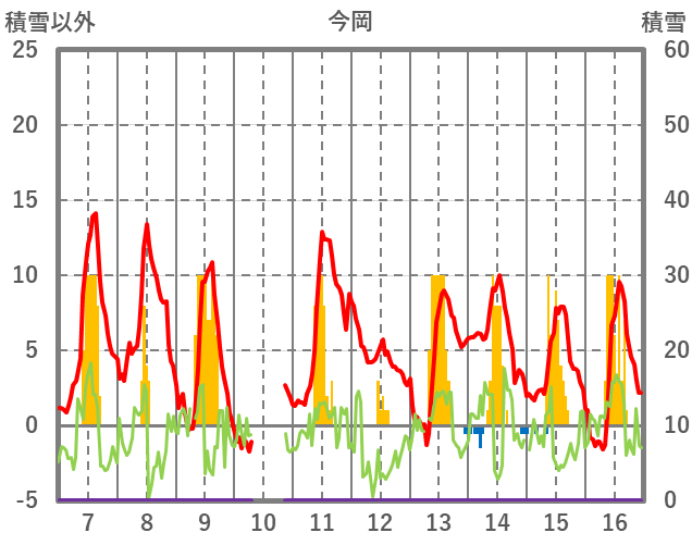 | 日 | 時 | 気温 | 降水 | 風向/風速 | 日照 | 積雪 | 降雪 |