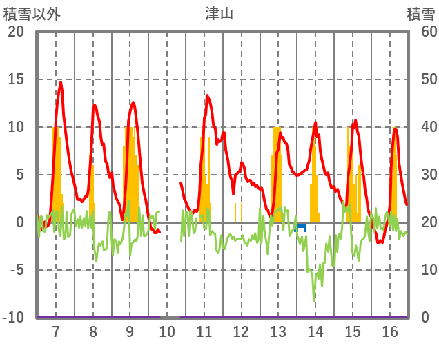 | 日 | 時 | 気温 | 降水 | 風向/風速 | 日照 | 積雪 | 降雪 |