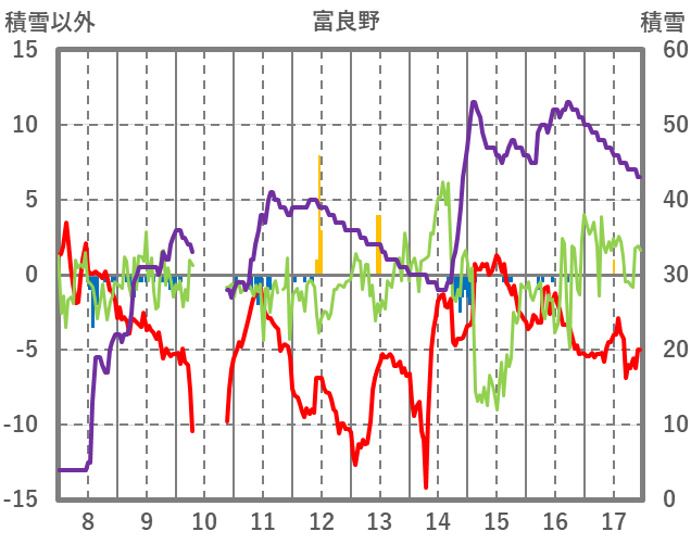 | 日 | 時 | 気温 | 降水 | 風向/風速 | 日照 | 積雪 | 降雪 |