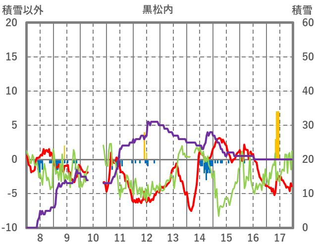 | 日 | 時 | 気温 | 降水 | 風向/風速 | 日照 | 積雪 | 降雪 |