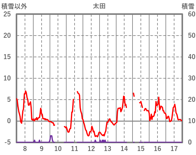| 日 | 時 | 気温 | 降水 | 風向/風速 | 日照 | 積雪 | 降雪 |