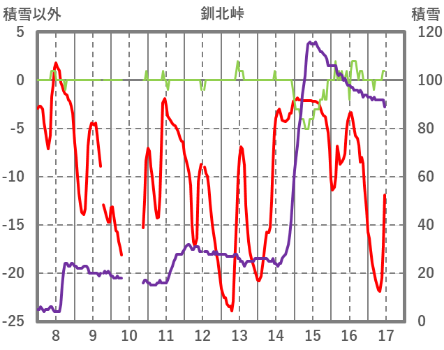 | 日 | 時 | 気温 | 降水 | 風向/風速 | 日照 | 積雪 | 降雪 |