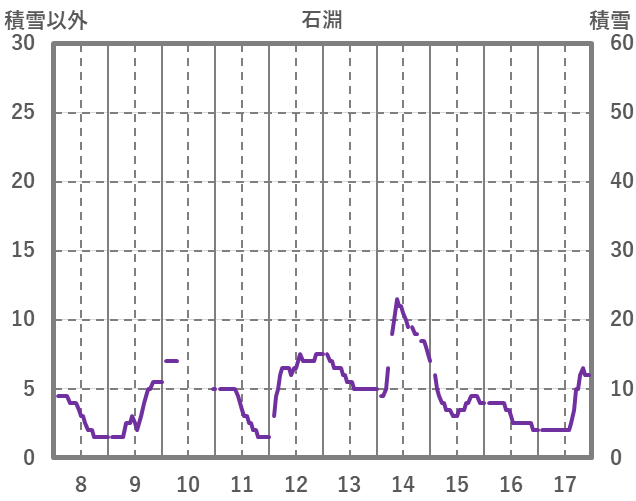 | 日 | 時 | 気温 | 降水 | 風向/風速 | 日照 | 積雪 | 降雪 |