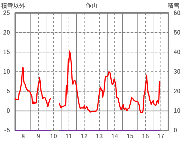 | 日 | 時 | 気温 | 降水 | 風向/風速 | 日照 | 積雪 | 降雪 |