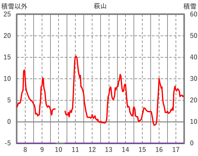 | 日 | 時 | 気温 | 降水 | 風向/風速 | 日照 | 積雪 | 降雪 |