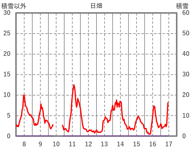 | 日 | 時 | 気温 | 降水 | 風向/風速 | 日照 | 積雪 | 降雪 |