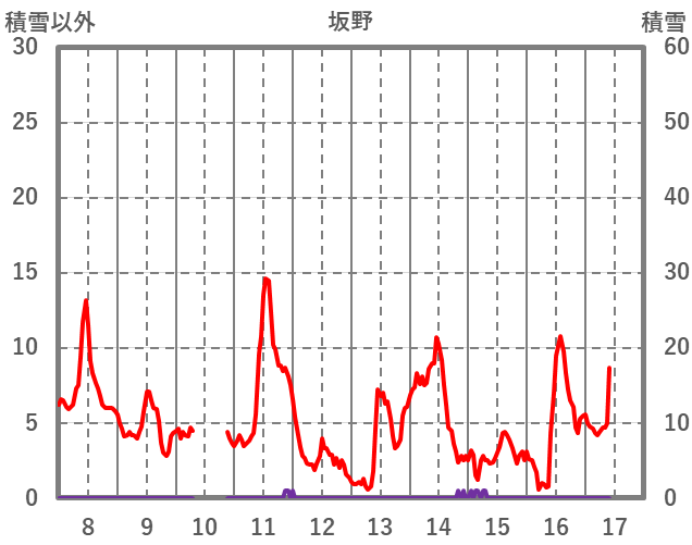 | 日 | 時 | 気温 | 降水 | 風向/風速 | 日照 | 積雪 | 降雪 |