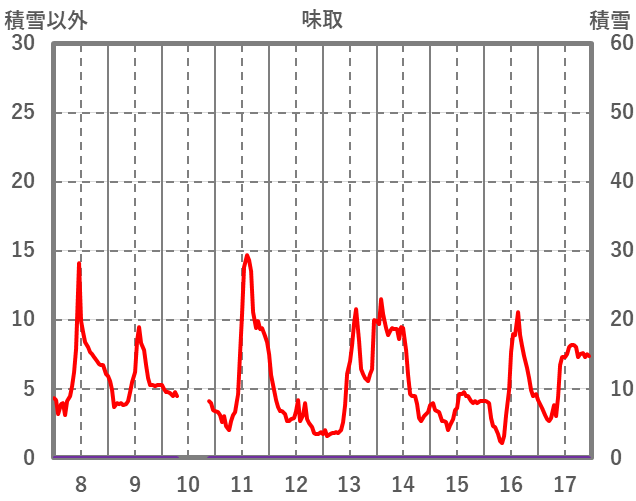 | 日 | 時 | 気温 | 降水 | 風向/風速 | 日照 | 積雪 | 降雪 |