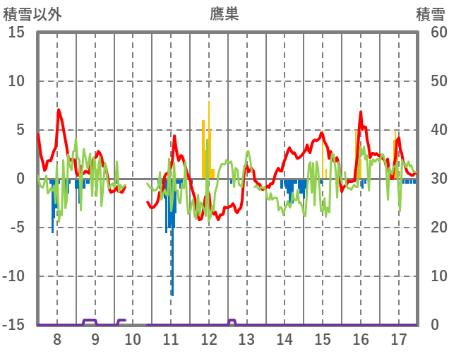 | 日 | 時 | 気温 | 降水 | 風向/風速 | 日照 | 積雪 | 降雪 |