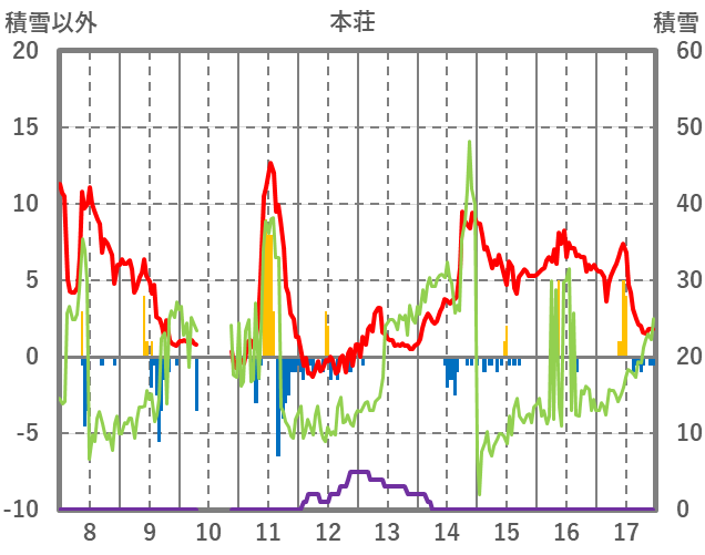 | 日 | 時 | 気温 | 降水 | 風向/風速 | 日照 | 積雪 | 降雪 |
