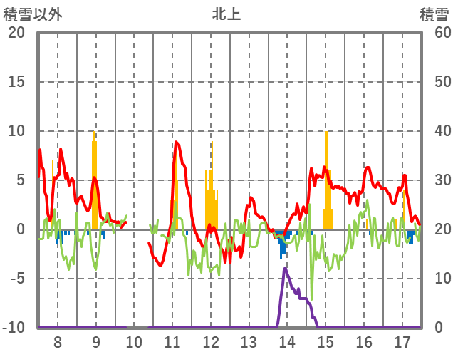 | 日 | 時 | 気温 | 降水 | 風向/風速 | 日照 | 積雪 | 降雪 |