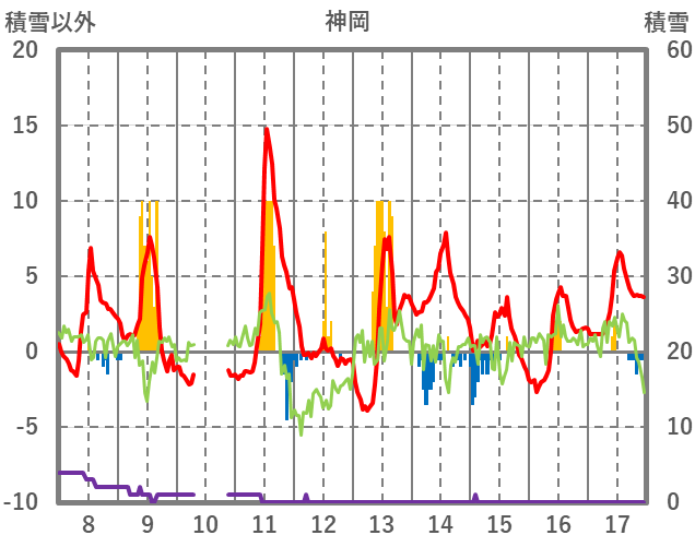 | 日 | 時 | 気温 | 降水 | 風向/風速 | 日照 | 積雪 | 降雪 |