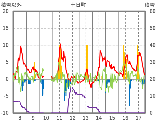 | 日 | 時 | 気温 | 降水 | 風向/風速 | 日照 | 積雪 | 降雪 |
